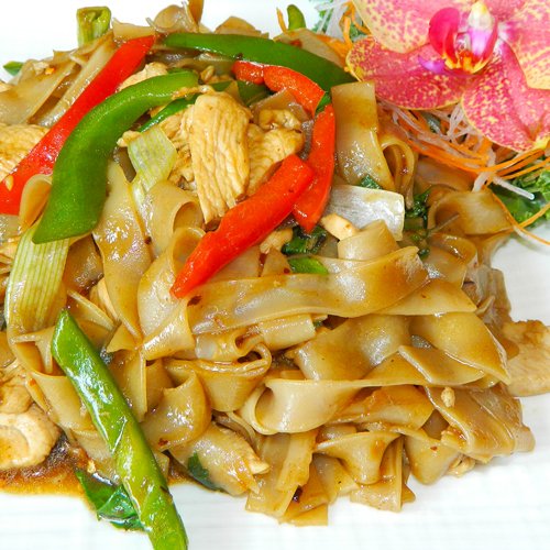 Tasty Thai noodles with chicken, onions, bell peppers and fresh basil, served in our special house chili sauce.